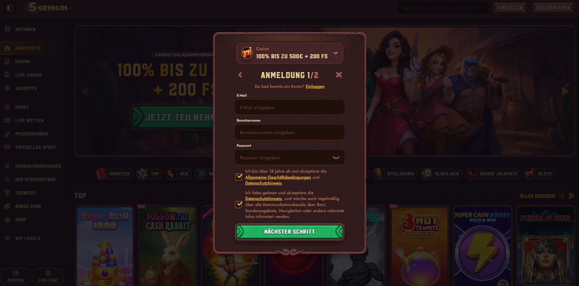 Ich habe 5Gringos mehrere Tage lang getestet: von der Registrierung über den Bonus und die Spiele bis hin zu den Auszahlungen. Die Anmeldung war schnell erledigt, die Verifizierung hat knapp 24 Stunden gedauert. Danach konnte ich ohne Einschränkungen einzahlen und spielen. Meine erste Einzahlung über Skrill war sofort verfügbar und der Willkommensbonus ließ sich direkt im Zahlungsfenster aktivieren.