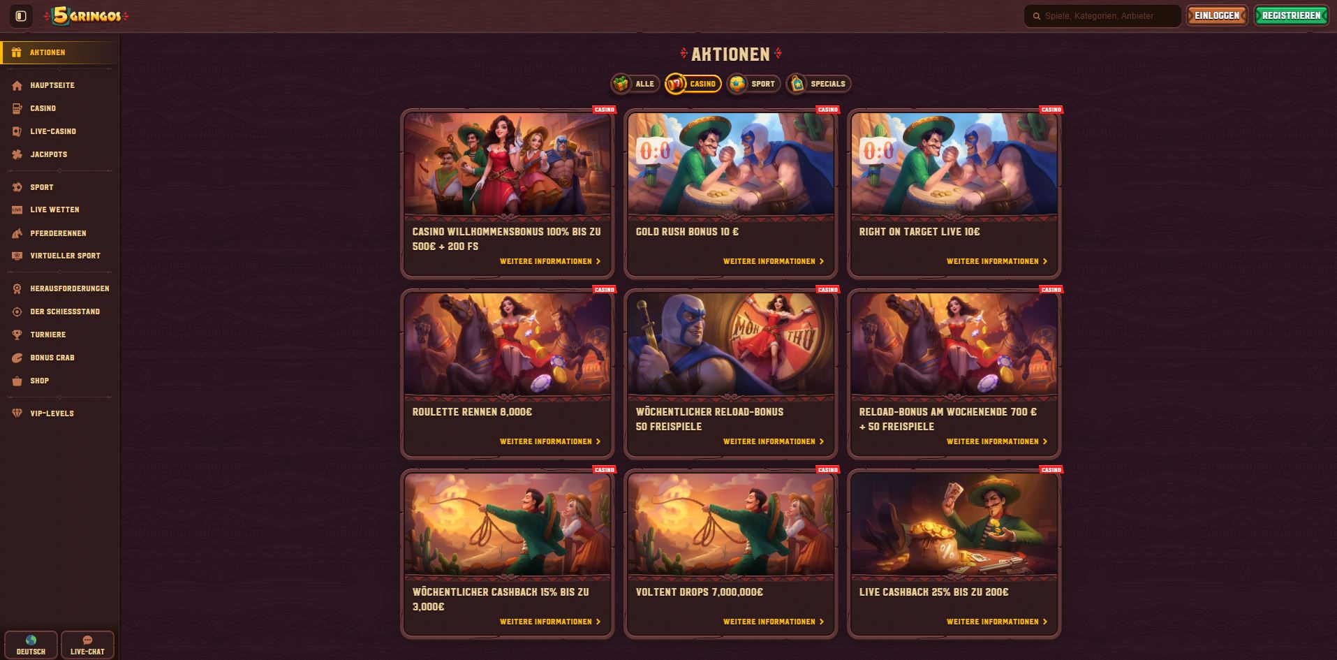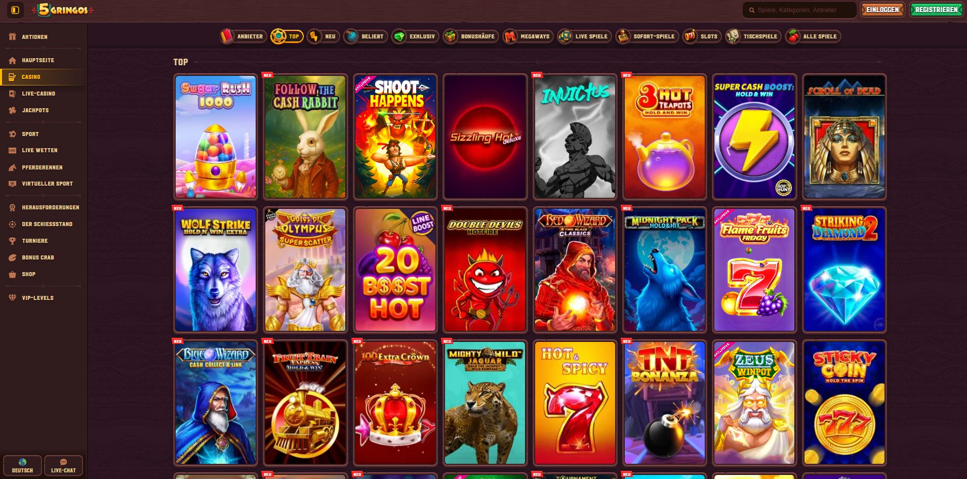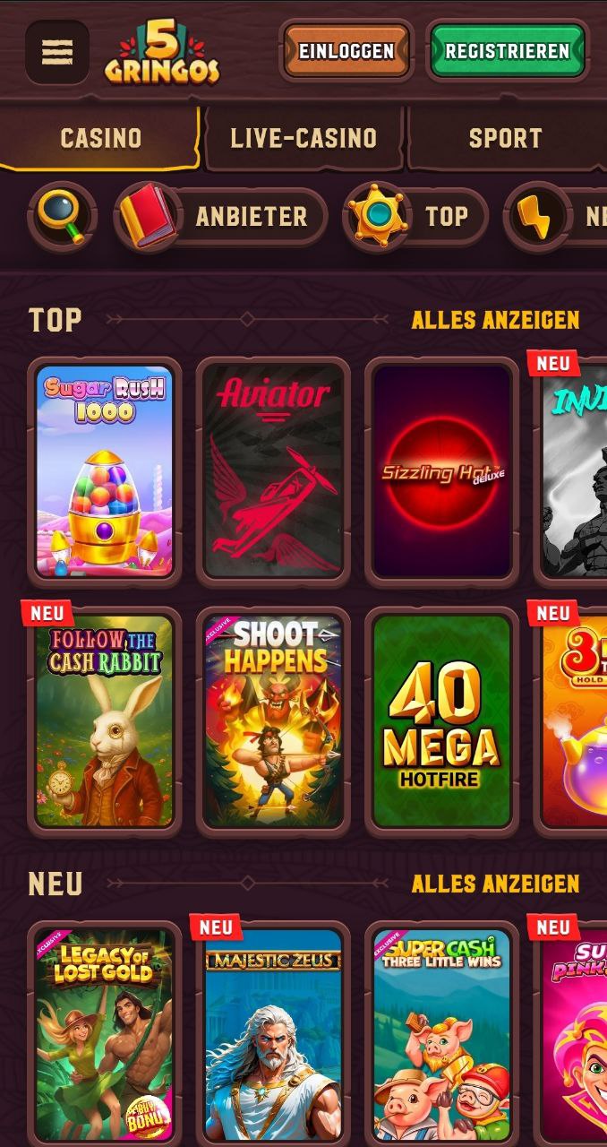 Die Lobby von 5Gringos ist klar gegliedert: Slots, Jackpots, Tischspiele und ein eigener Bereich fürs Live-Casino. Die Suche reagiert zuverlässig, auch wenn ein Filter nach Providern fehlt. Spiele starten zügig, Demo-Versionen lassen sich direkt laden, und auf dem Handy läuft die Oberfläche flüssig. Besonders positiv ist, dass Klassiker wie Book of Dead oder Starburst ebenso vertreten sind wie neue Titel mit Bonus-Buy-Optionen.